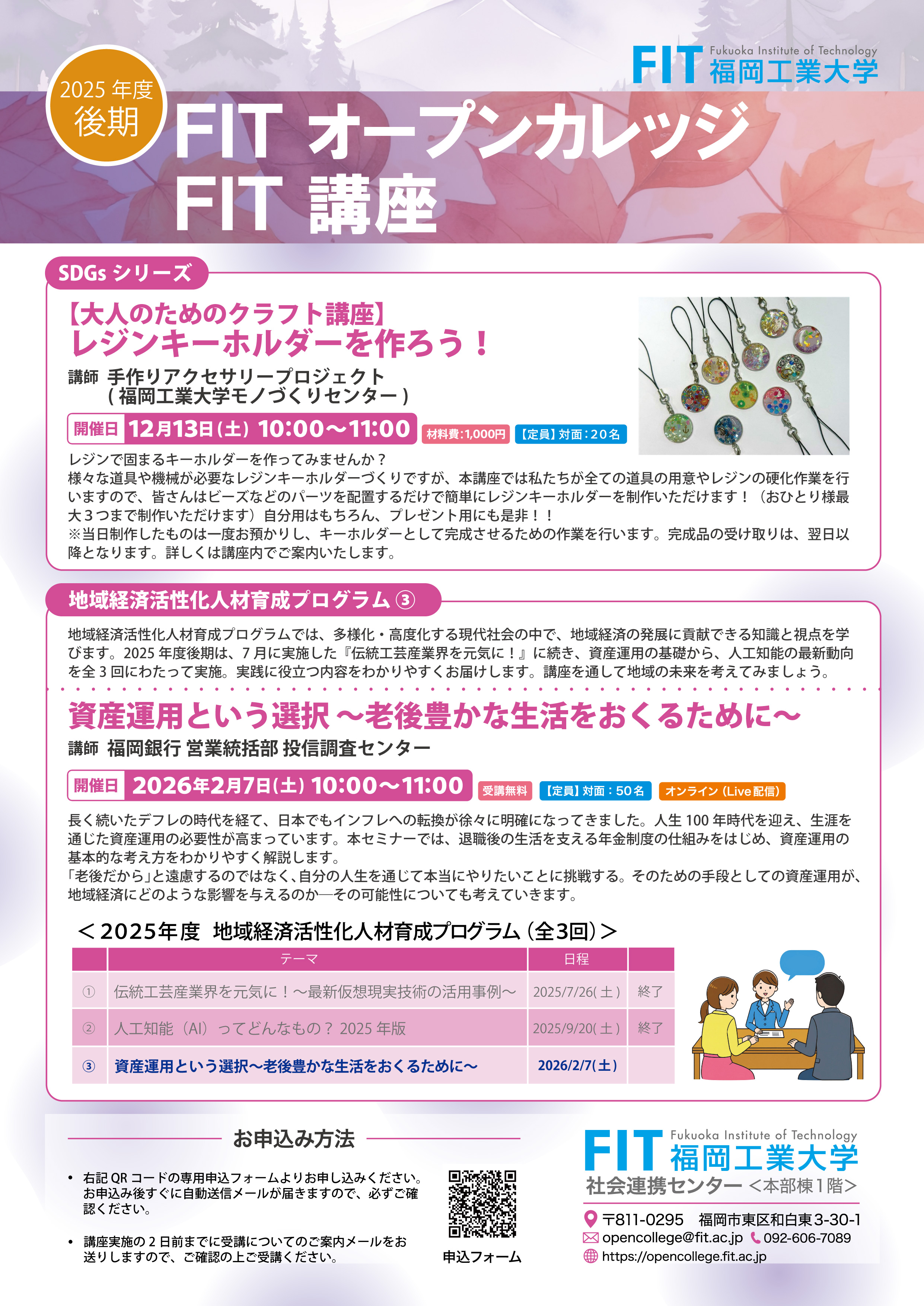 2025年度 文化教養講座[後期]、FIT講座[後期]の募集を9月1日(月)より開始致します。詳細は各講座のページをご確認ください。お申込みはインターネットの下記フォームよりお手続き頂きますようお願い申し上げます。・文化教養講座 無料見学(...